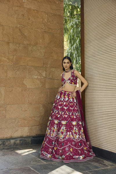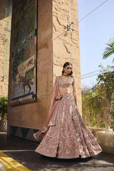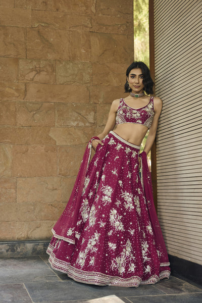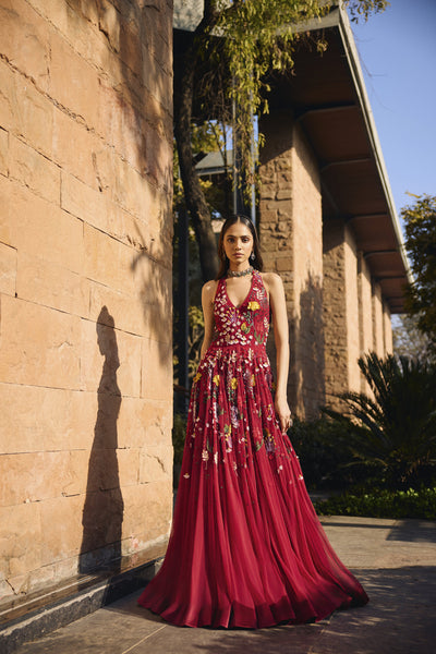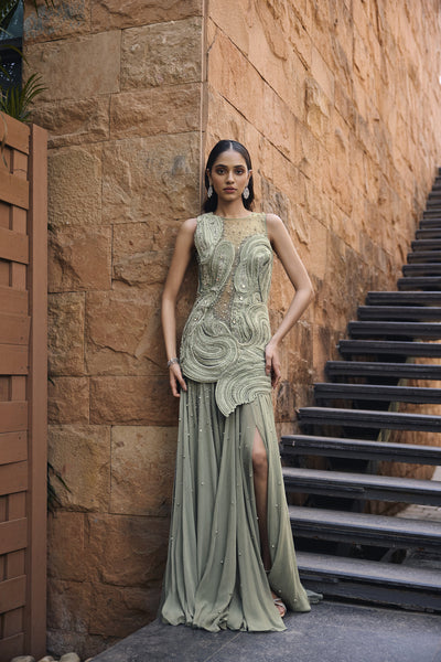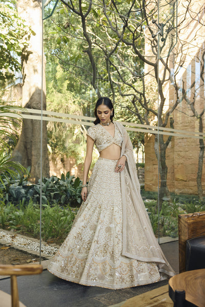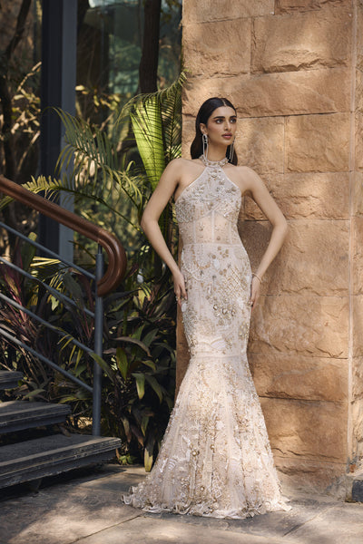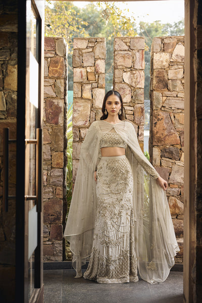The collection "Rooh" draws inspirations from the jungles of India, which have forever been an object of curiosity; they have innumerable mystical and mythological tales attached to them. The mystique of the forests is brought to life through Jungle silhouettes rendered in ivory applique on translucent organza, exotic wild flowers come alive with silk floss 3d embroidery. Ivory hand cut 3d applique creates surreal foliage right out of an enchanted forest.