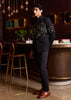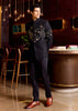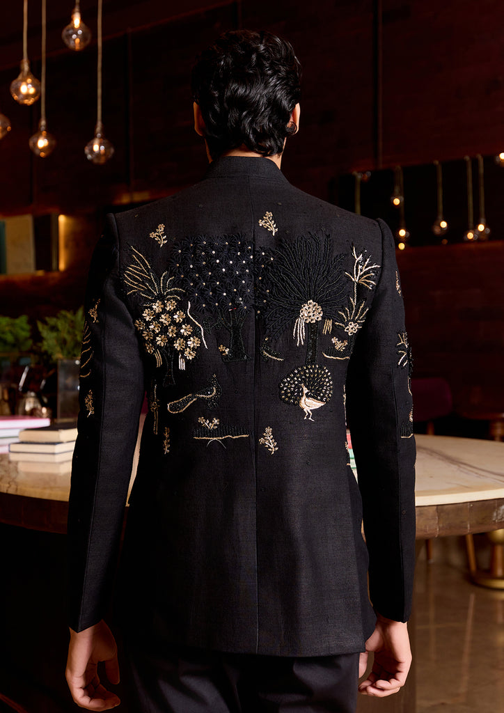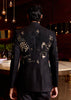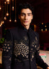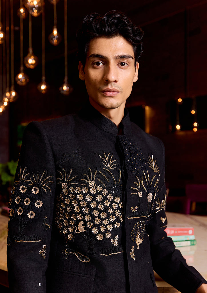 PIVESH Bandgala in Black Matka Silk, featuring intricate applique and hand embroidery.