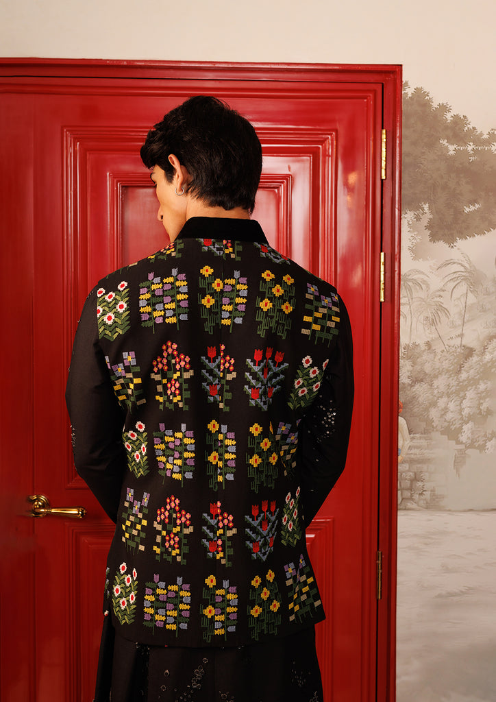 Black bundi made of katan fabric featuring multicolored floral hand embroidery.
