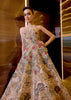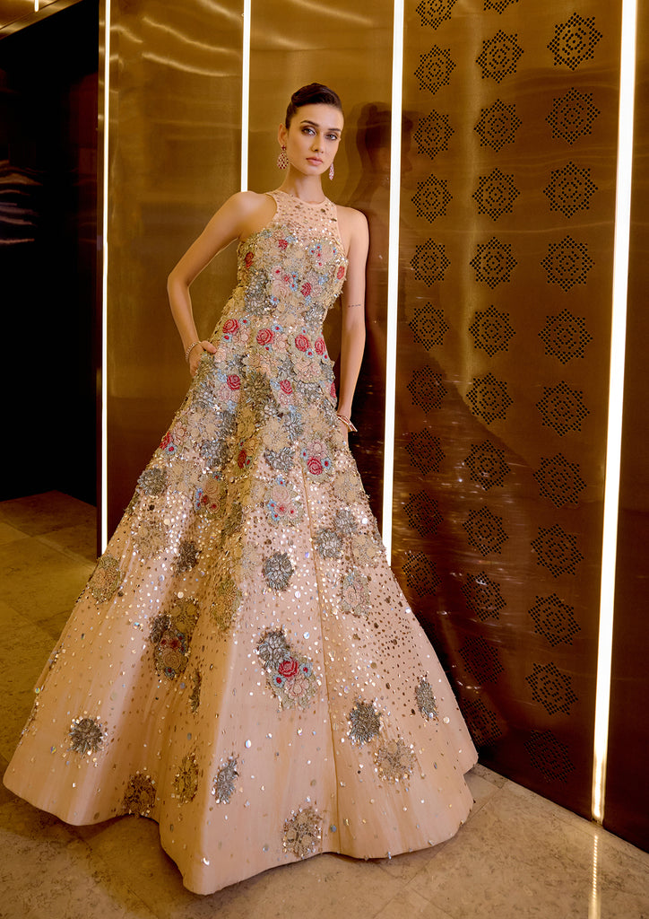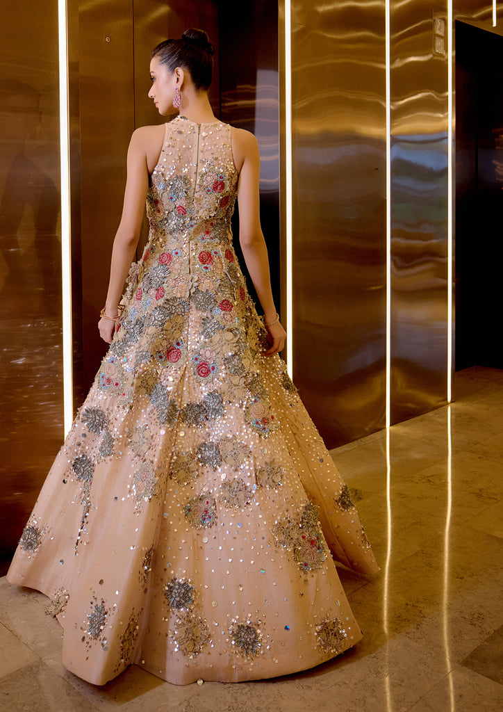 Mahz Gown in Peach Silk Organza, featuring intricate applique and hand embroidery.
