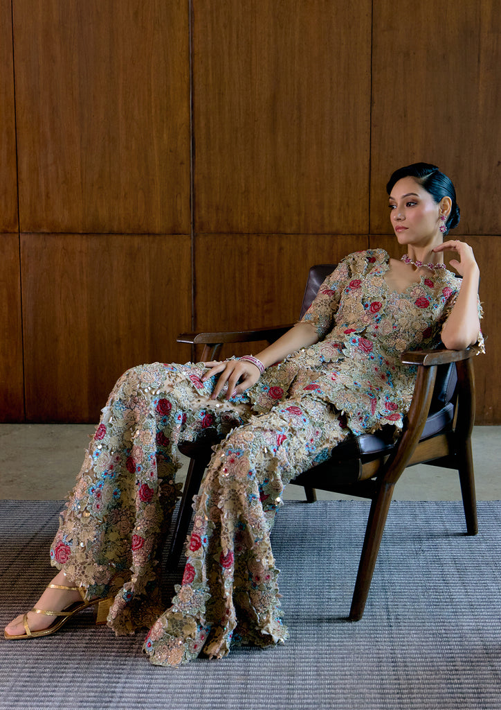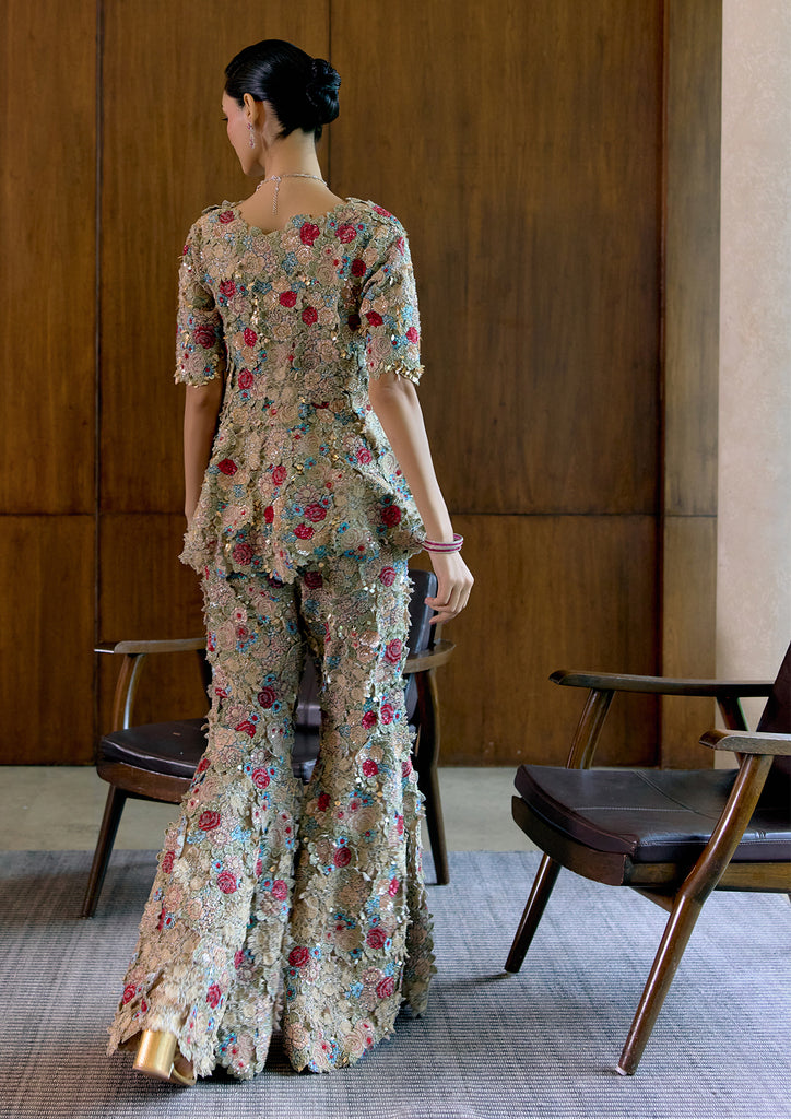 Saivi Top and Pant set in Wax Silk Soft Net, adorned with intricate applique and hand embroidery.