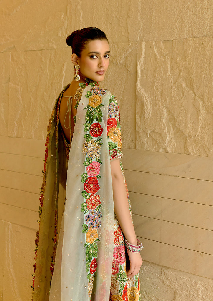 Shalvi Anarkali set in Multicolour Silk Dupion, featuring intricate applique and hand embroidery.