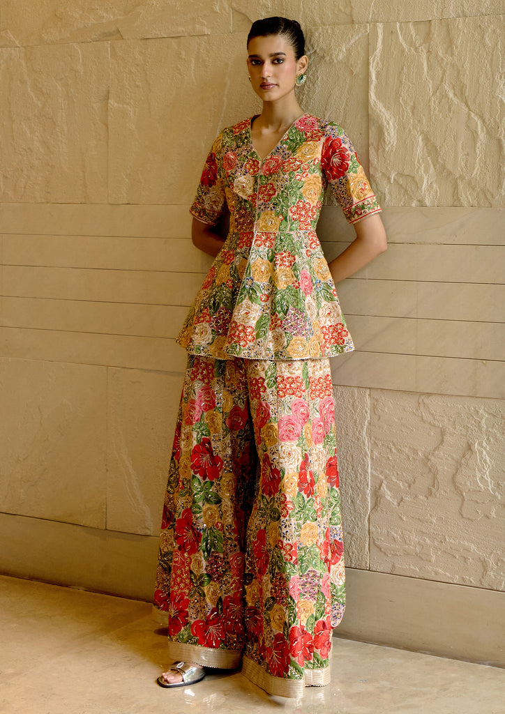 Peplum Top and Sharara set in Multicolour Silk Dupion, featuring intricate applique and hand embroidery.