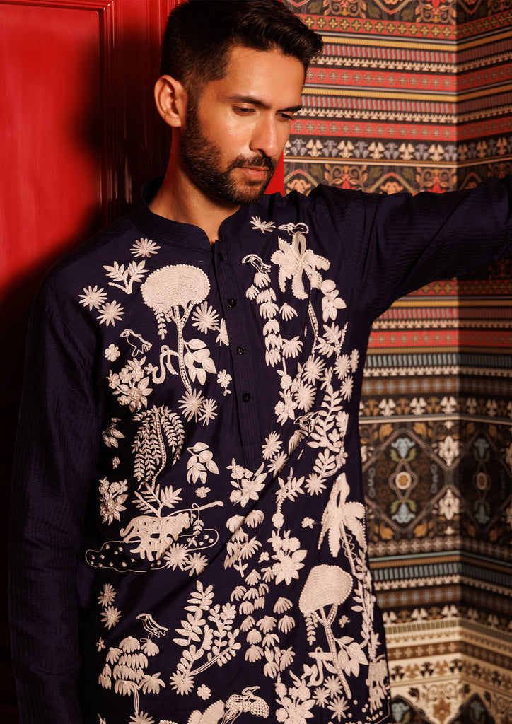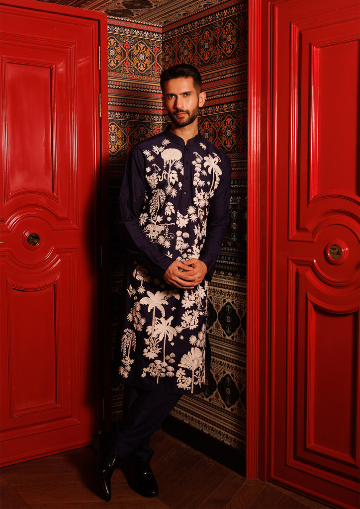 A blue kurta in luxurious Katan fabric, richly hand-embroidered with striking ivory botanical motifs. An eye-catching choice for celebrations that demand statement style.
