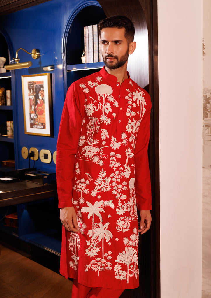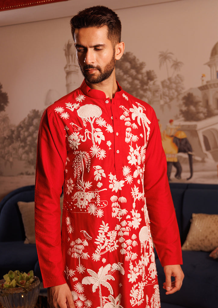 A red kurta in luxurious Katan fabric, richly hand-embroidered with striking ivory botanical motifs. An eye-catching choice for celebrations that demand statement style.