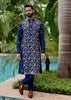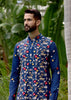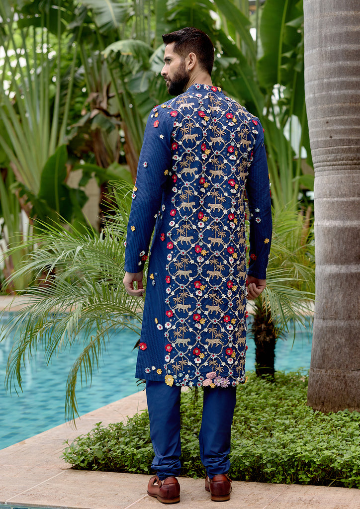 A refined navy silk katan kurta paired with churidar, elevated with intricate applique and hand embroidery. Timeless elegance crafted with precision.