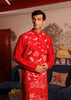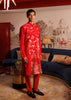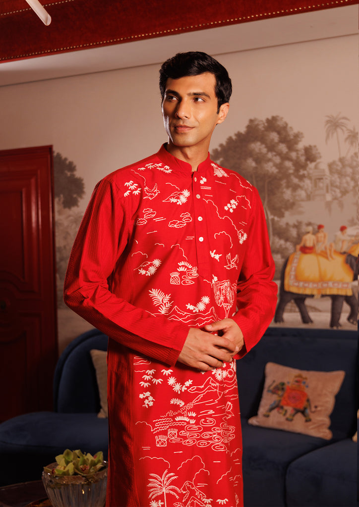 Red kurta crafted in fine Katan fabric, adorned with intricate white thread embroidery depicting scenic nature motifs.