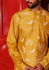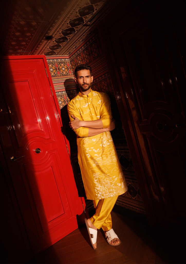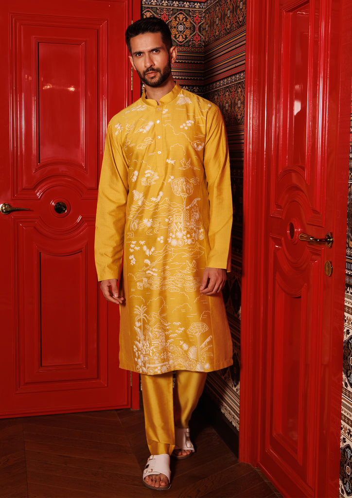 Yellow kurta crafted in fine Katan fabric, adorned with intricate white thread embroidery depicting scenic nature motifs.