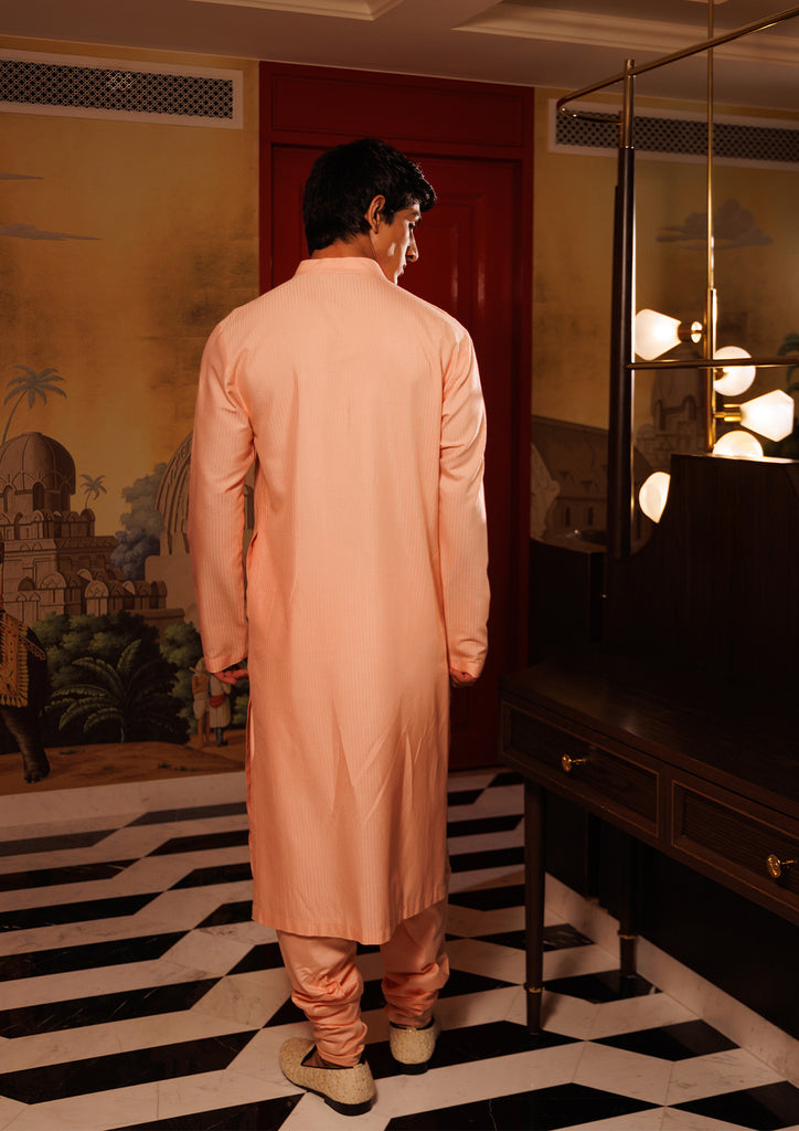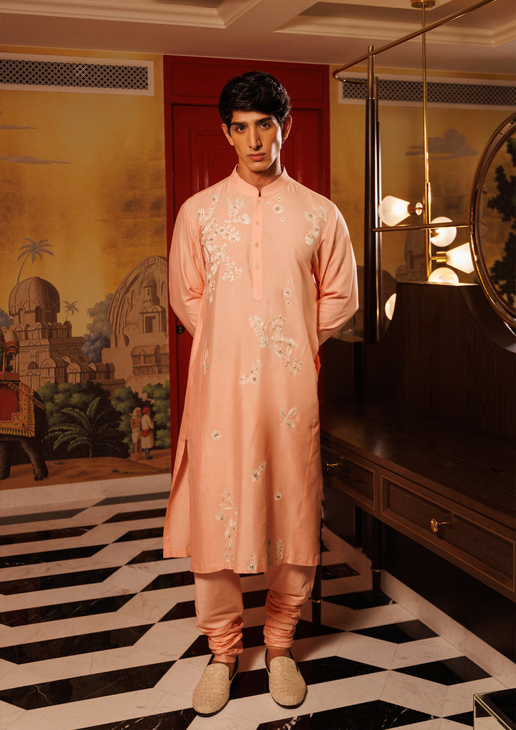 Pink kurta featuring delicate floral embroidery and an asymmetrical hem. Ideal for festive occasions that call for a touch of playful elegance.