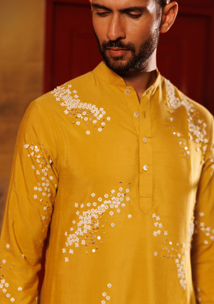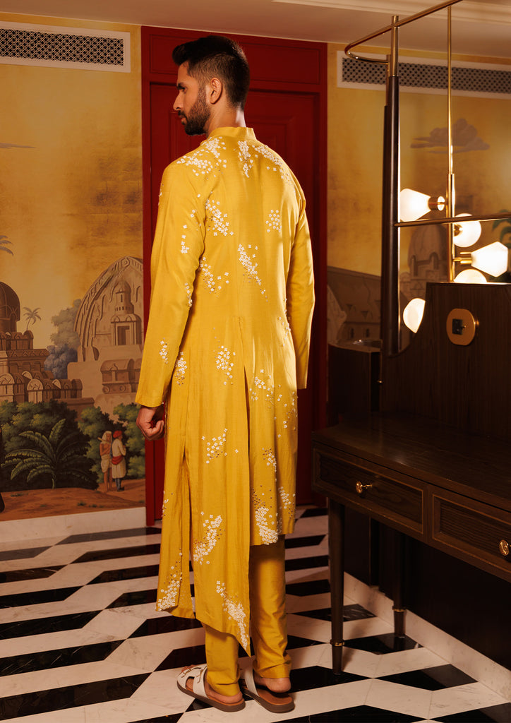 Yellow kurta featuring delicate embroidery and an asymmetrical hem. Ideal for festive occasions that call for a touch of playful elegance.