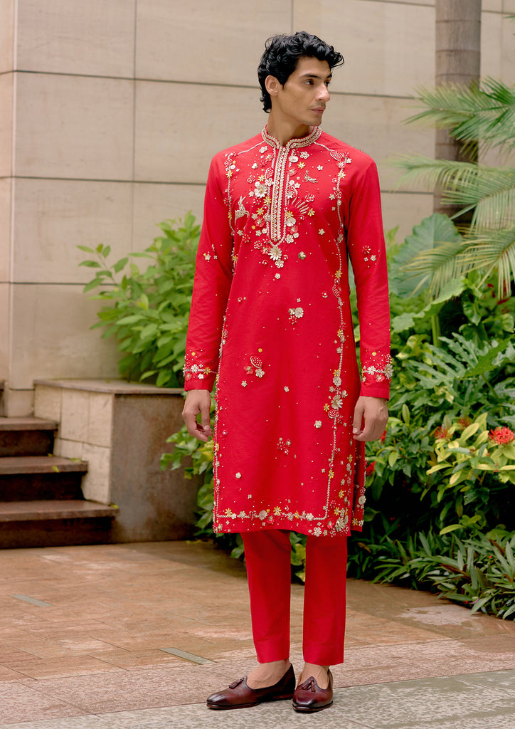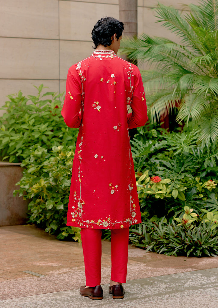 A striking red silk katan kurta with trouser, elevated by applique and hand embroidery.