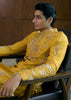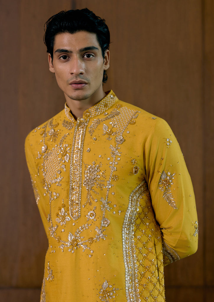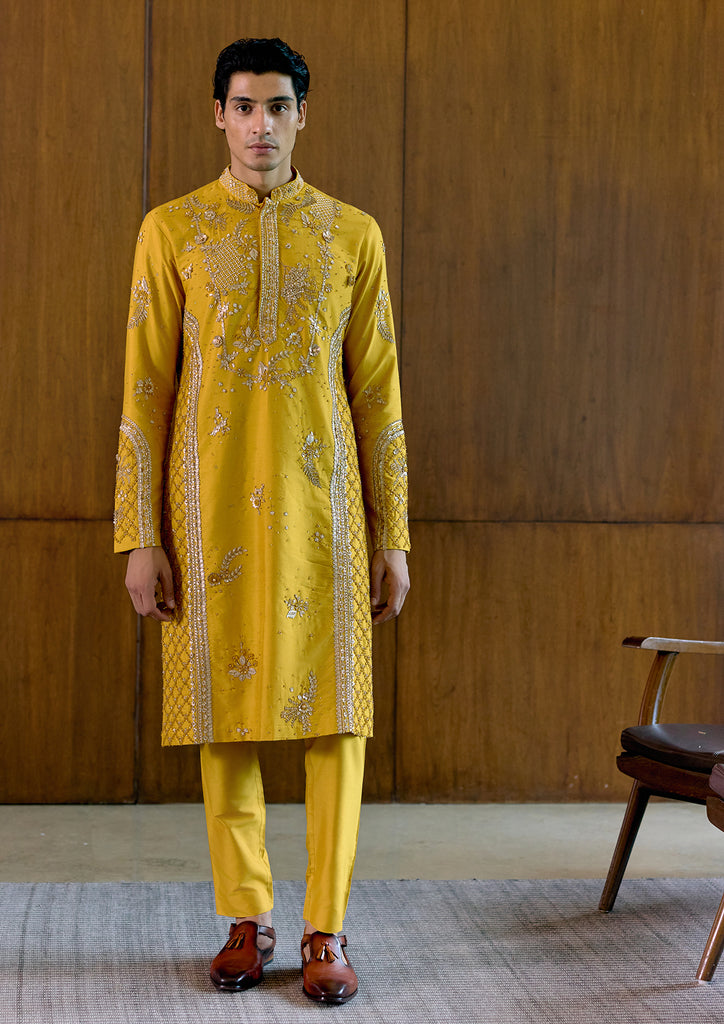 VITHARV Kurta set in Yellow Silk Katan, adorned with exquisite applique and hand embroidery.