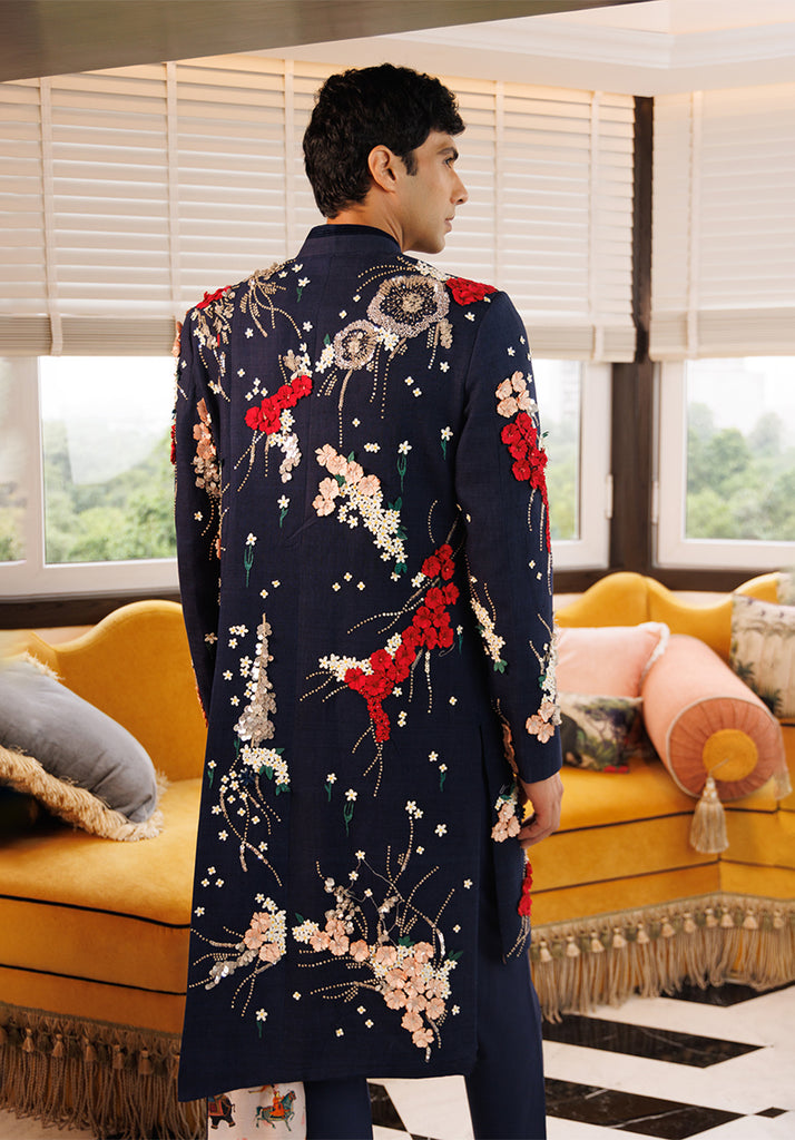 A blue sherwani intricately embellished with hand embroidery and applique work. Perfect for a modern groom embracing timeless tradition.