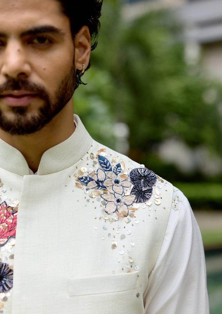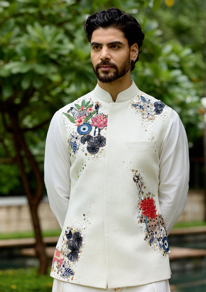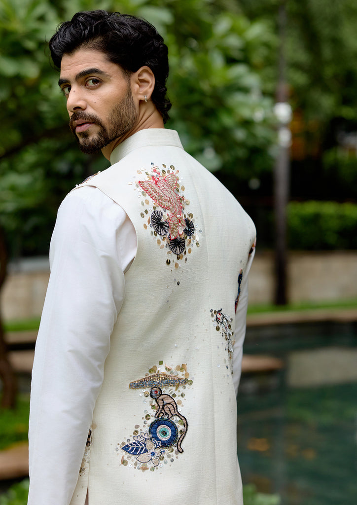 An ivory Bundi crafted in rich matka silk, elevated with delicate applique and intricate hand embroidery. A timeless piece blending tradition with artistry.