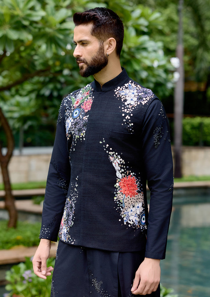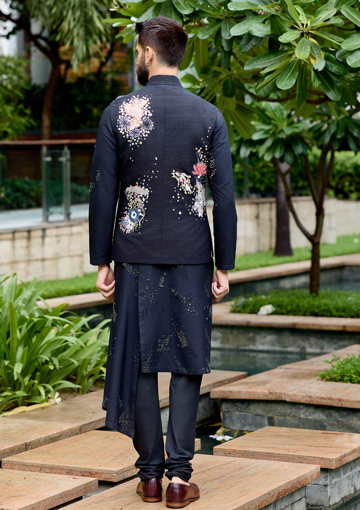 KRATIGYA Bundi in Black Matka Silk, adorned with intricate applique and hand embroidery.