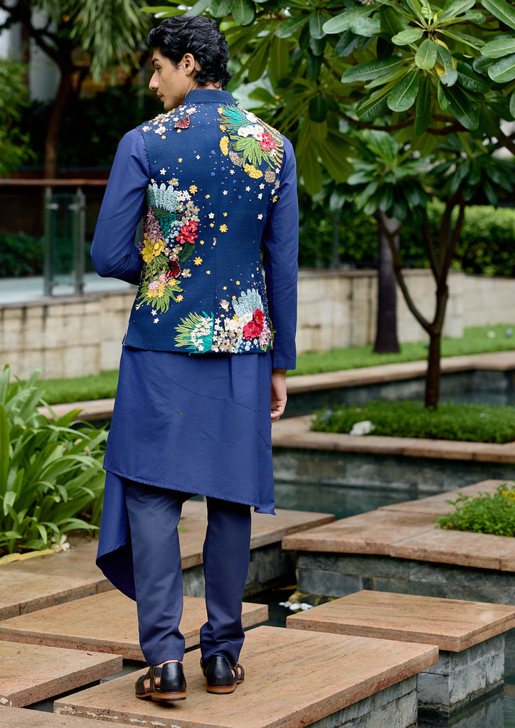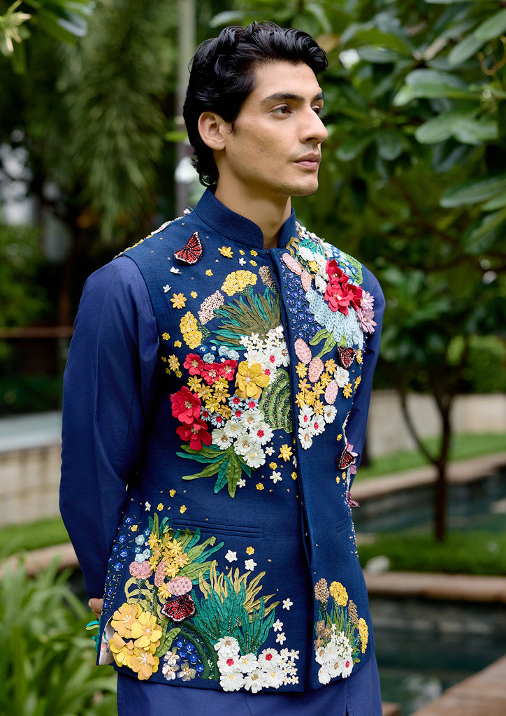 Nivash Bundi in rich navy Matka silk, adorned with intricate applique and fine hand embroidery. A timeless fusion of craft and elegance.