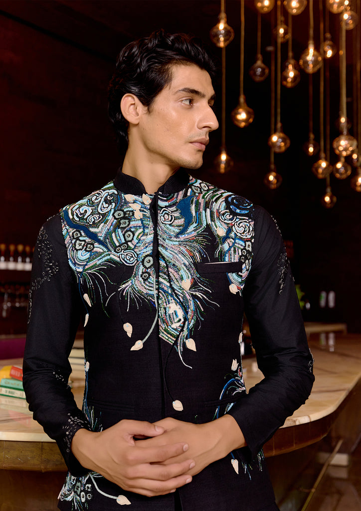 A striking black matka silk bundi detailed with applique and hand embroidery.
