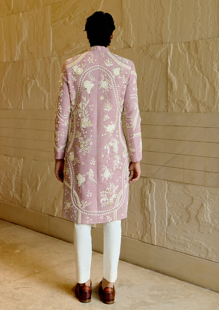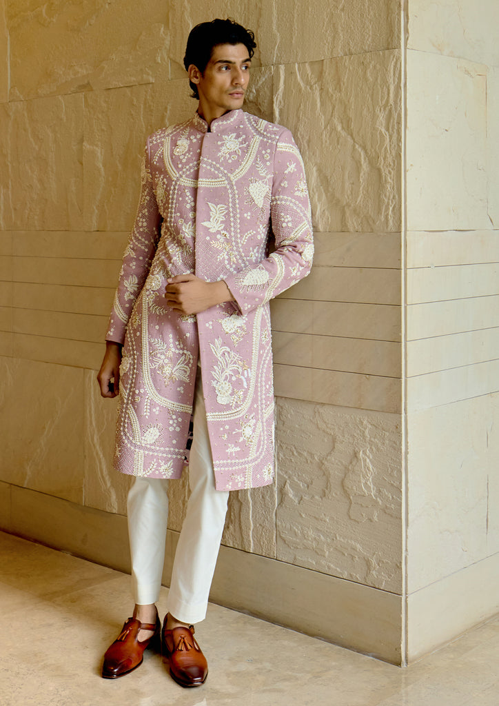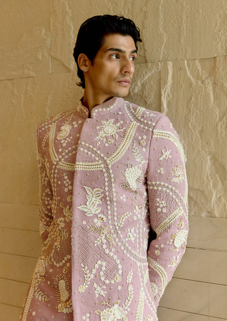 A peach sherwani in fine Matka silk with trouser, detailed with applique and hand embroidery.