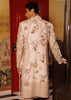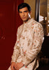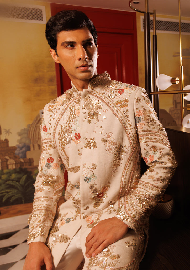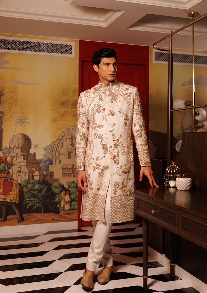 A pristine ivory sherwani intricately embellished with subtle pastel embroidery and delicate motifs. Perfect for a modern groom embracing timeless tradition.