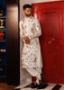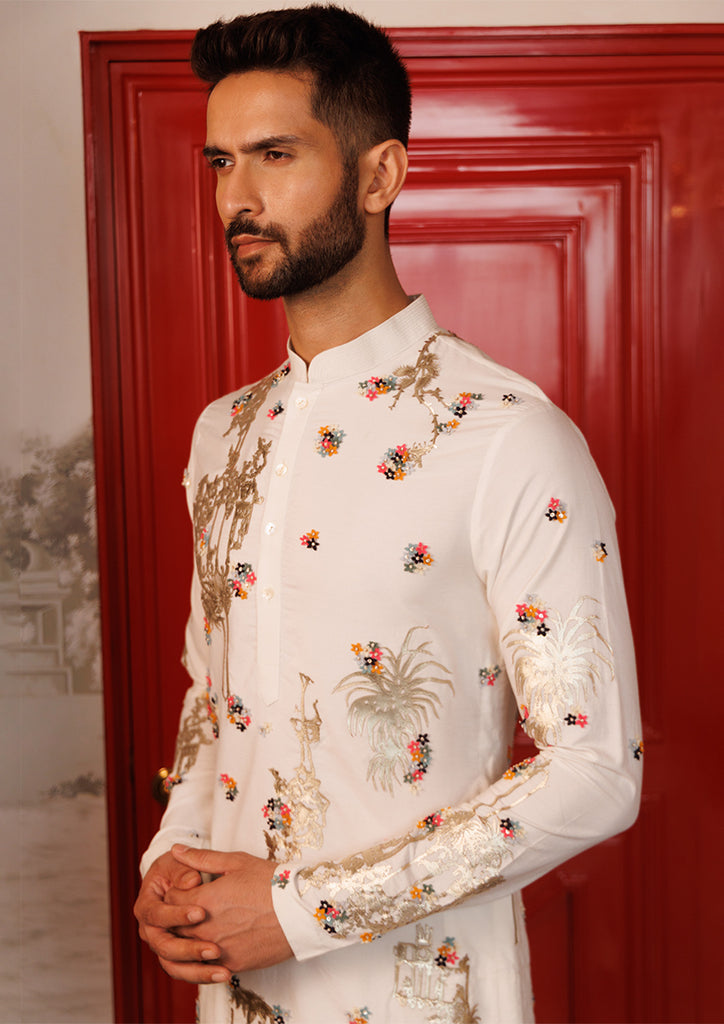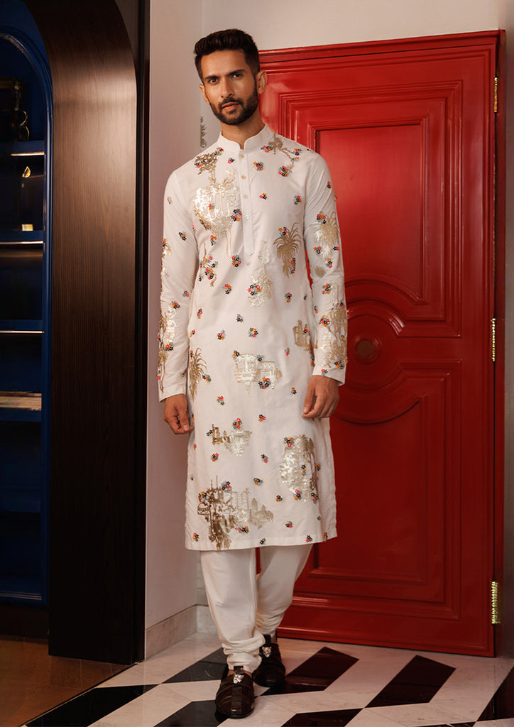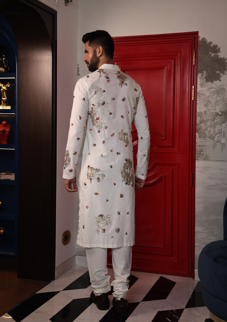 A ivory Katan kurta has applique and hand embroidery. It has floral motifs with golden details