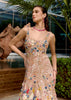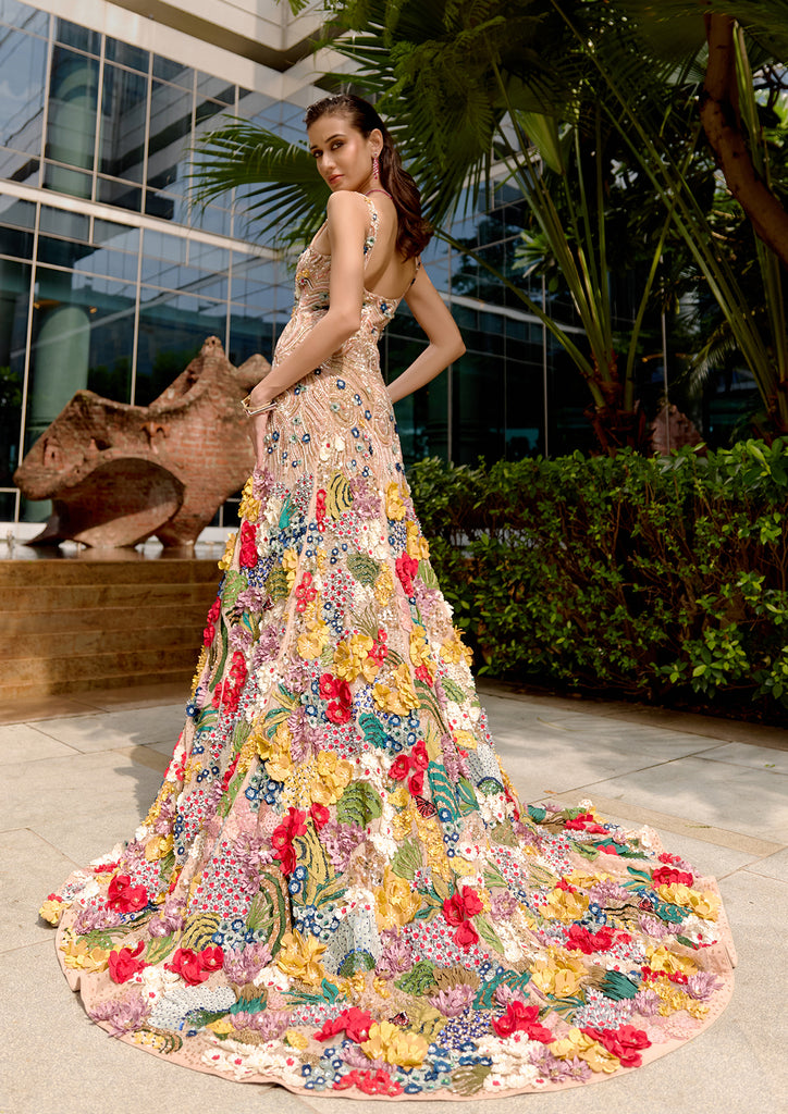 Saras Gown in Pink Silk Soft Net, featuring intricate applique and hand embroidery.