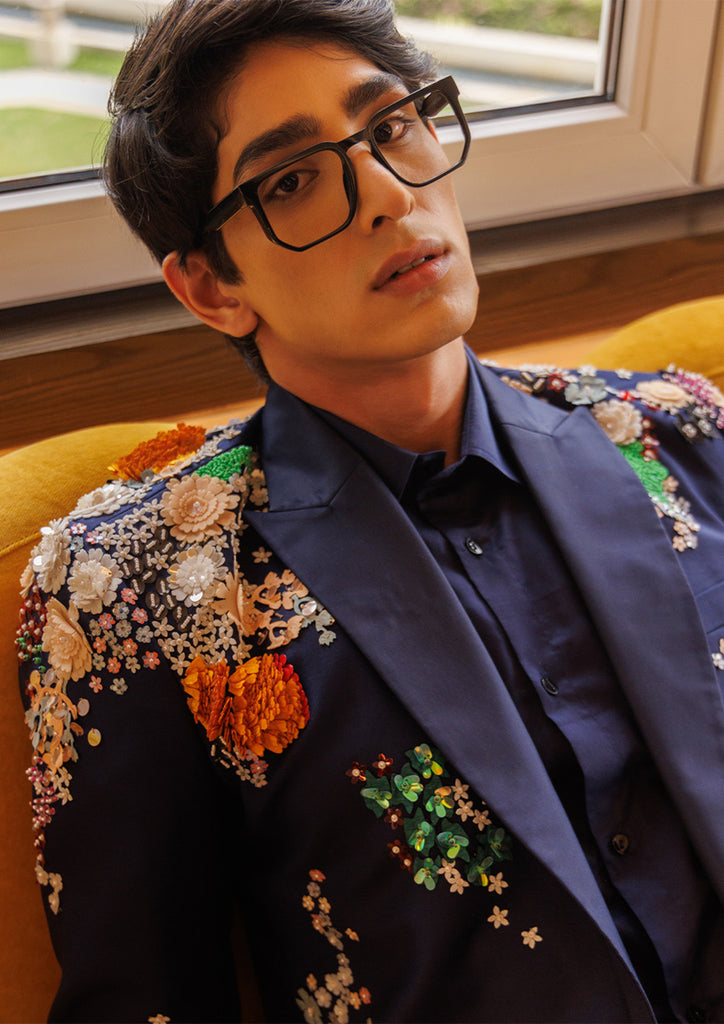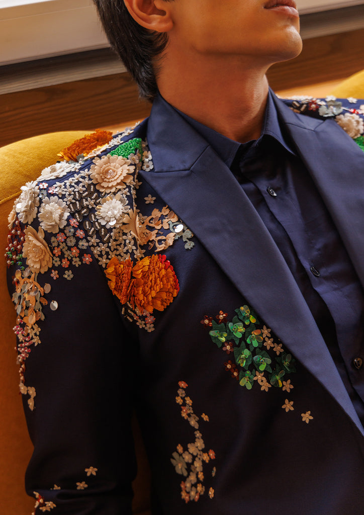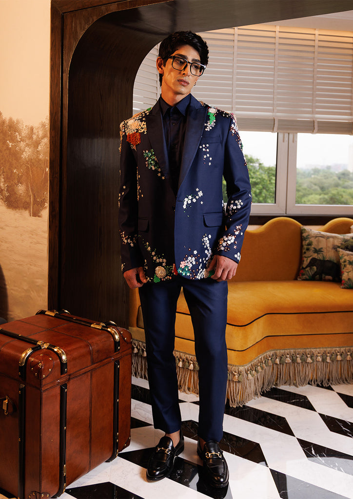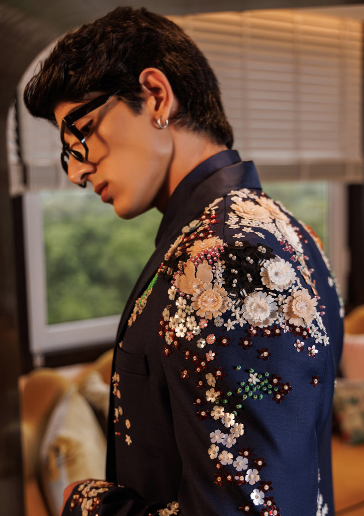 A classic tuxedo elevated with intricate hand embroidery and floral embellishments. Perfect for evening soir??es where bold elegance makes a statement.
