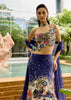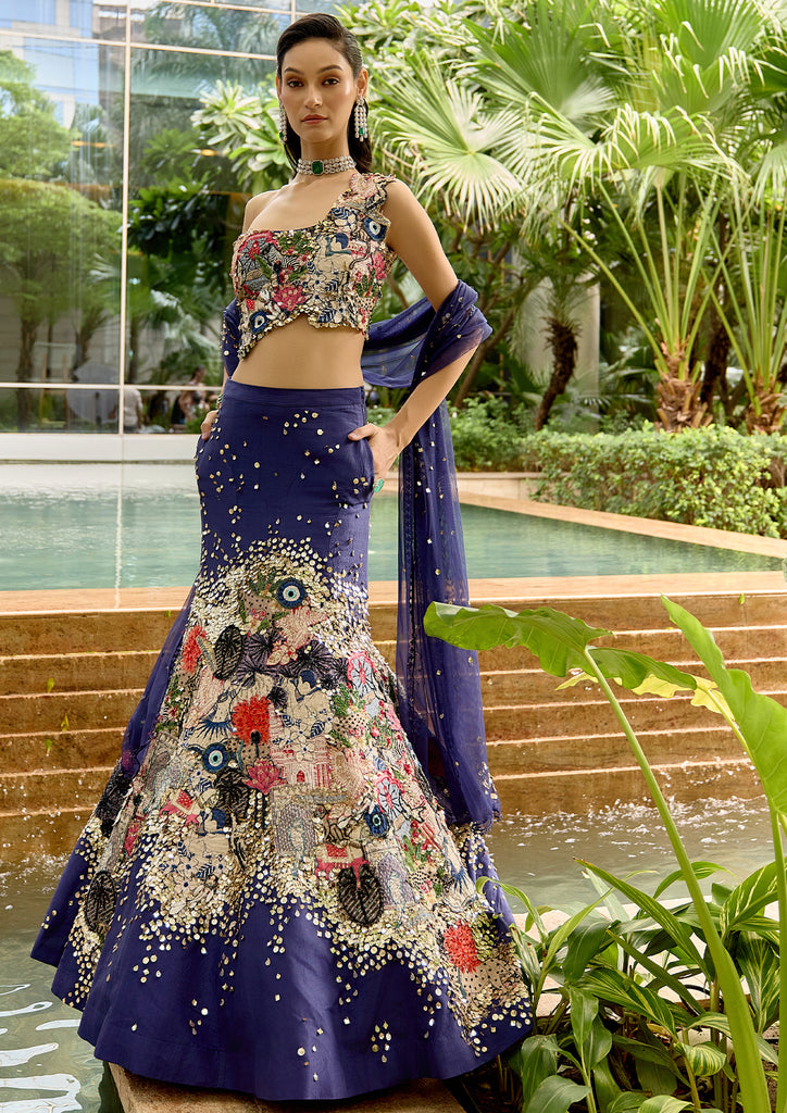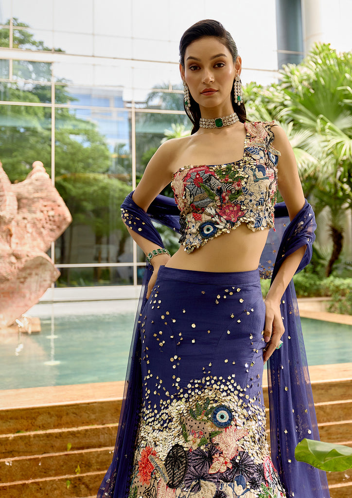 Siara Lehenga set in Navy Silk Organza, adorned with intricate applique and hand embroidery.