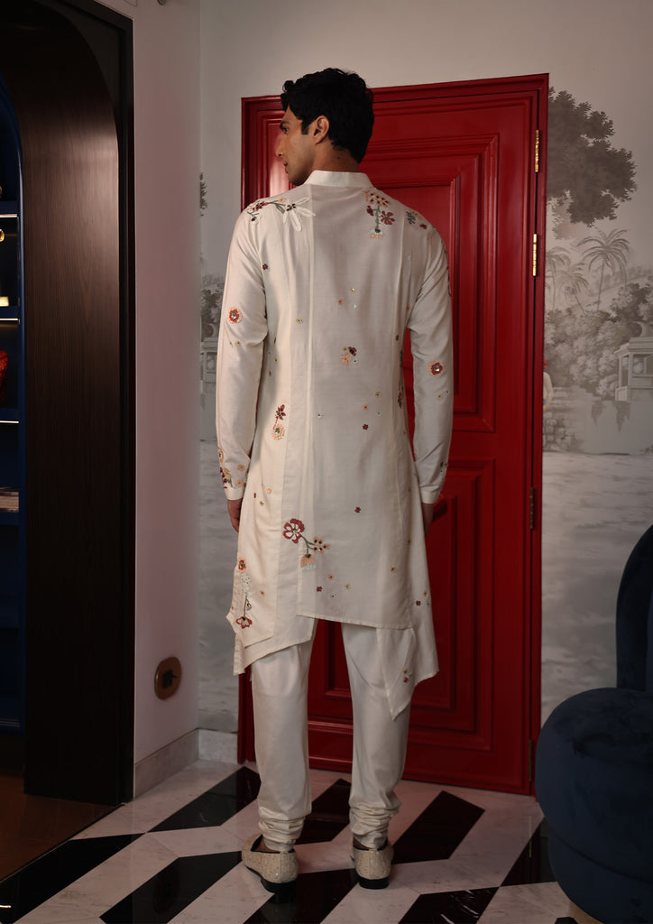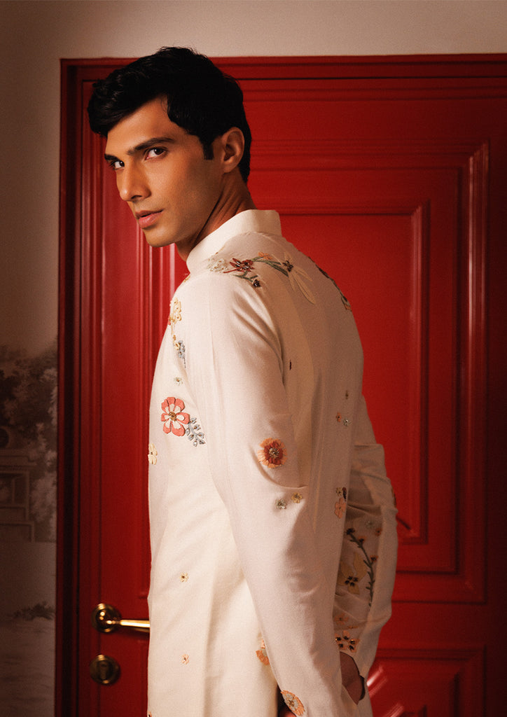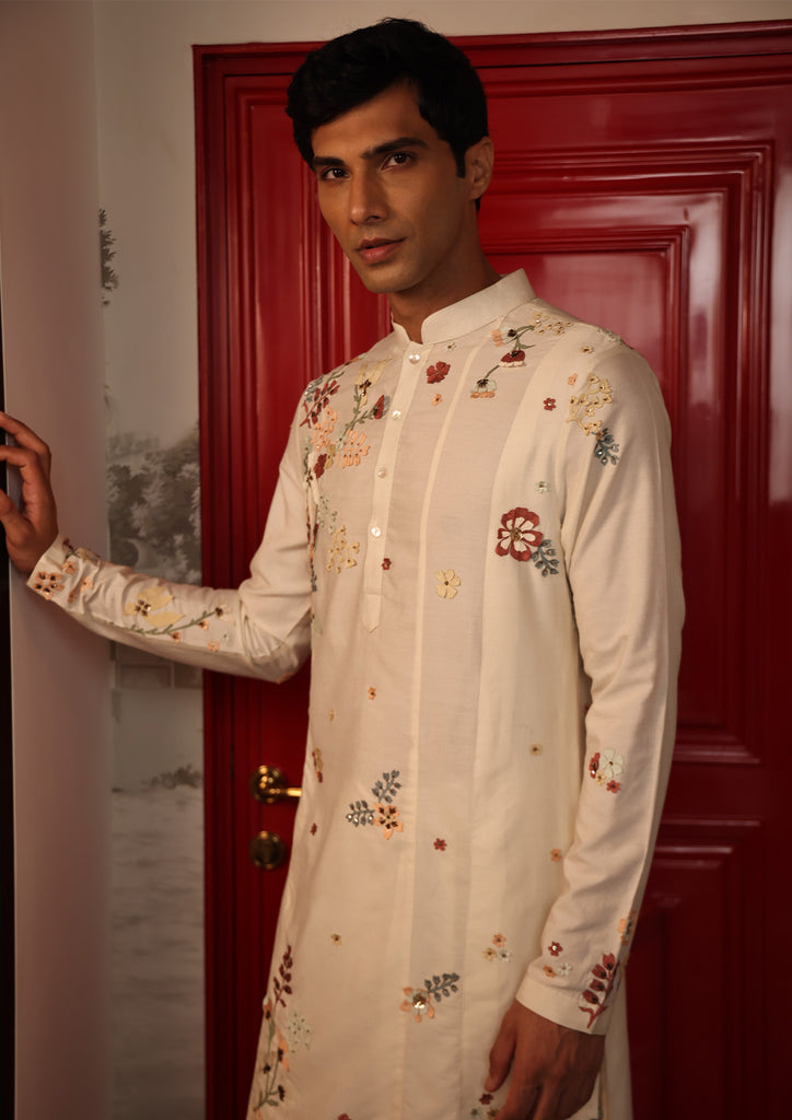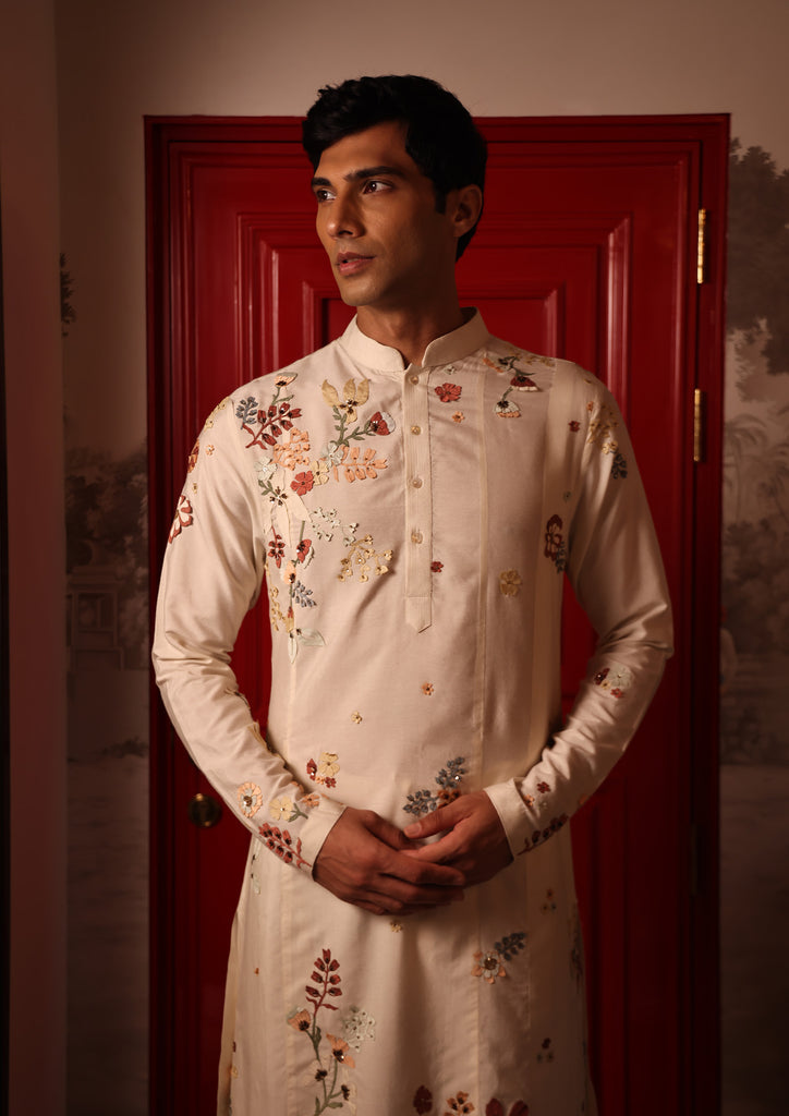 Crafted in luxurious Katan fabric, this ivory kurta features exquisite applique work highlighted by meticulous hand embroidery. The floral and motif detailing lends it a timeless elegance perfect for celebrations. A statement piece that balances classic craftsmanship with contemporary sophistication.