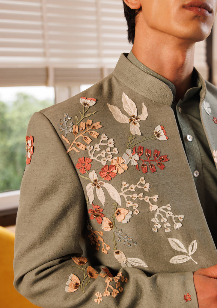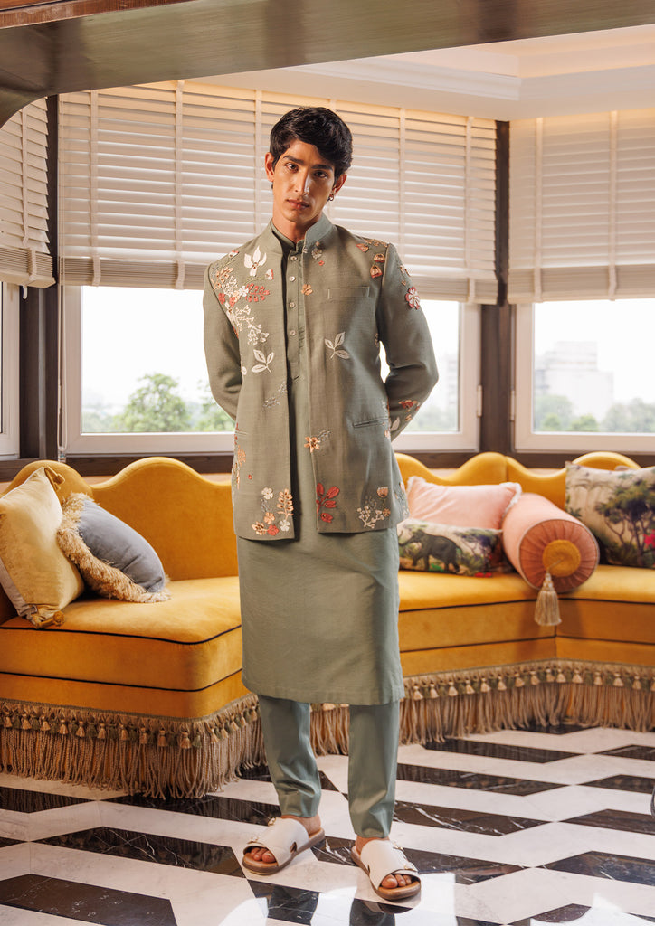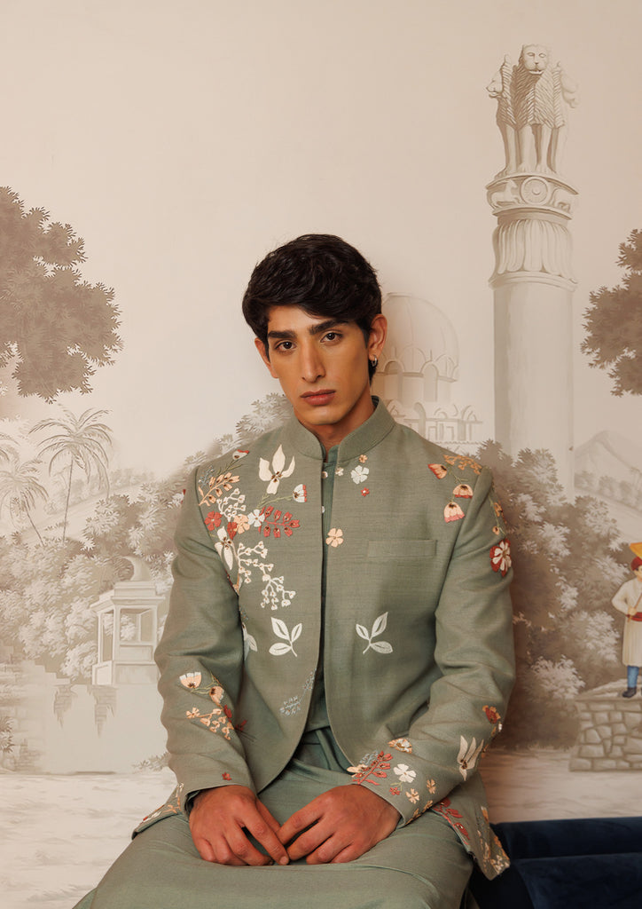 Bandgala intricately embellished with subtle pastel embroidery and delicate motifs. Perfect for a modern groom embracing timeless tradition.